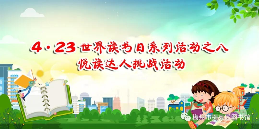 亲爱的读者朋友们,梅州市剑英图书馆2020 年“4·23”世界读书日系列活动已经开展一段时间啦~中华诗词答题、共读半小时、英文诗朗诵、英语口语展示、绘本创意秀征集、图像创意设计、摄影作品征集……这些有趣的活动你参加了么?今天我们再向大家介绍世界读书日系列活动之八——悦读达人挑战活动,欢迎大家踊跃参与,惊喜好礼等着你~主办单位: