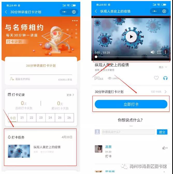 1、关注梅州市剑英图书馆微信公众号,点击下方菜单【活动】——【悦读达人挑战】进入活动页面。2、选择【我们来抗“疫”吧】模块下的【与名师相约】,点击【立即参加】。